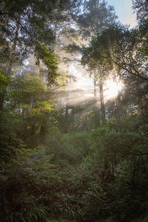 Lofty trees adorned with lush green leaves line the path of a California mountain, their majestic presence capturing the essence of nature's grandeur. As the sun filters through the foliage, a radiant beam of light bathes the scene, casting an ethereal glow upon the tranquil forest. July 1, 2021 | Mount Tamalpais, California