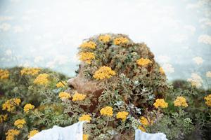 In a double exposure self-portrait, Black woman photographer Patience Zalanga gazes upwards, her brown coiled hair framing her face against the backdrop of a distant ocean. Superimposed upon her image are bright yellow yarrow flowers, intertwining with her likeness to create a visually vibrant representation of identity and connection to nature. July 2, 2021 | Montara, California