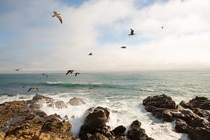 Seagulls soar gracefully above the rugged coastline of the California Pacific Ocean. In the foreground, weathered rocks frame the shoreline as waves crash against them. The vibrant hues of the aquamarine ocean blend seamlessly with the azure sky adorned with fluffy white clouds, creating a serene coastal tableau.
